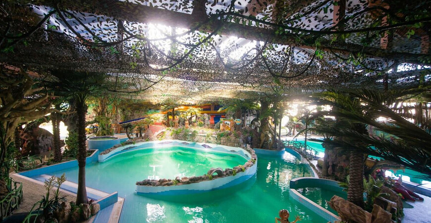 В самом аквапарке поддерживается комфортная температура воды и воздуха. Для придания атмосферы джунглей в помещении с водными аттракционами создана относительная влажность воздуха в районе 65–70%. Развлечения На территории зоны с водными развлечениями открыты для посещения горки и бассейны. На территории аквапарка 8 разных горок для взрослых и самых маленьких посетителей: